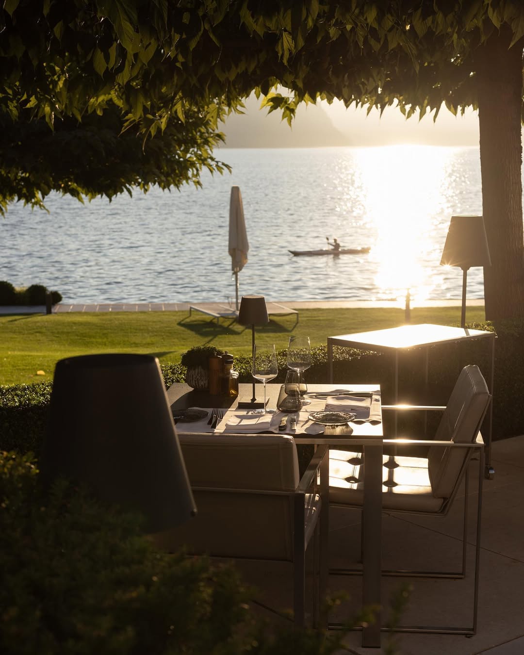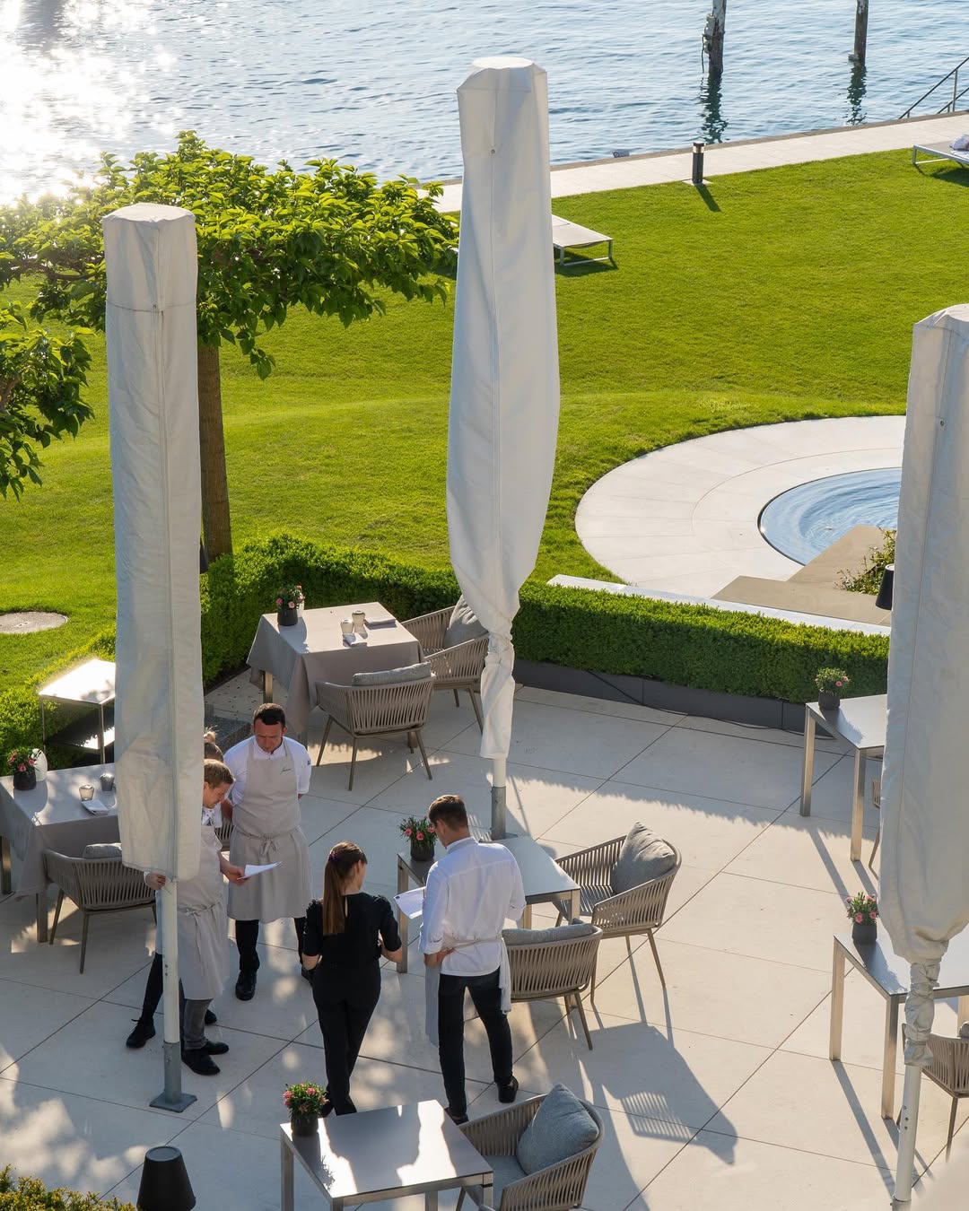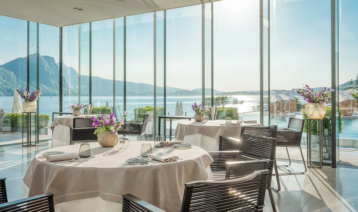 The restaurant is located in a glass pavilion with panoramic views of Lake Lucerne. The interior combines minimalism and elegance: light tones, natural materials, and pieces of contemporary art create an atmosphere of tranquility and luxury.