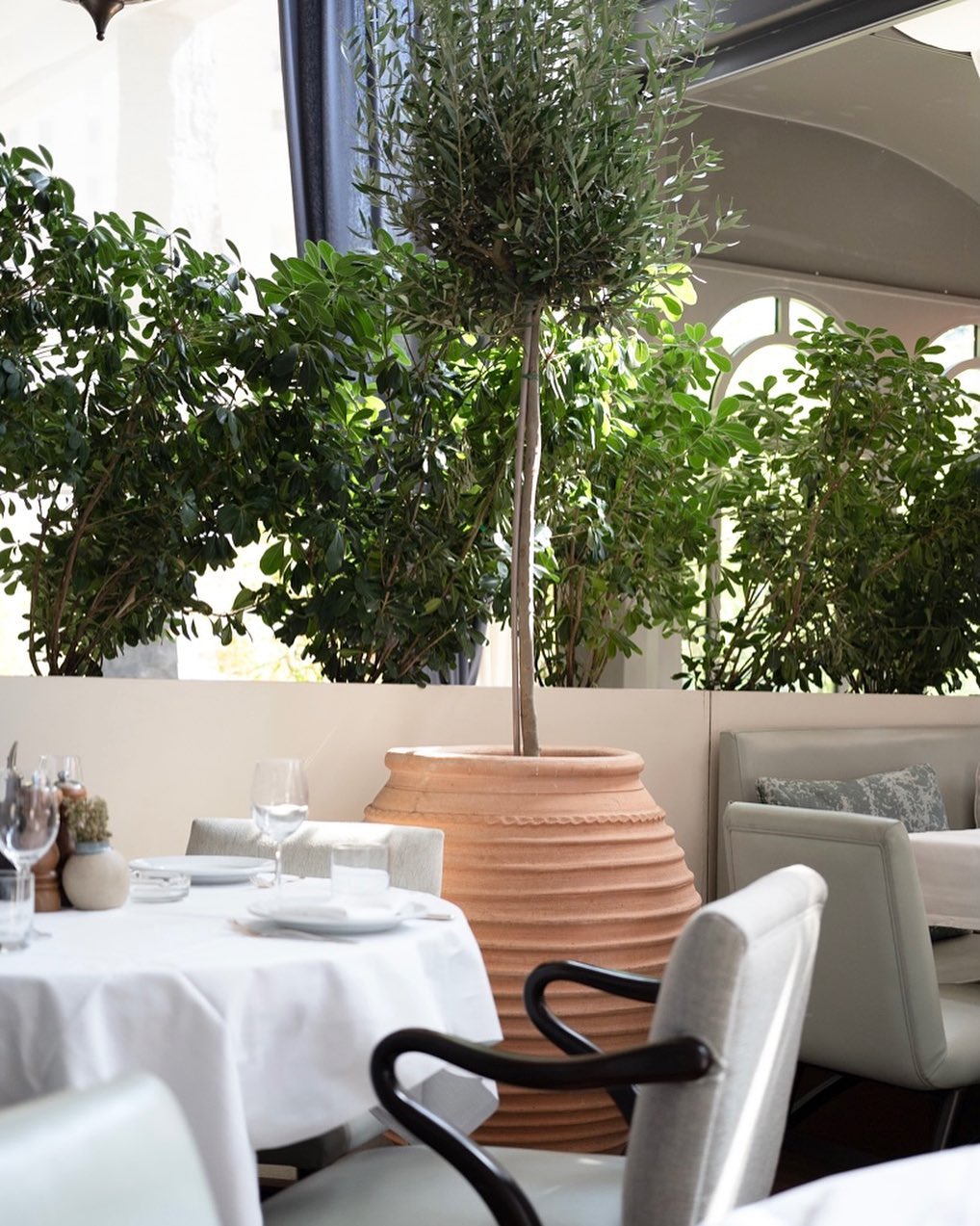 light textured walls, lots of natural wood, olive trees right in the room, terracotta accents and warm lighting. This is not ostentatious luxury, but quiet confidence. A taste that needs no explanation.