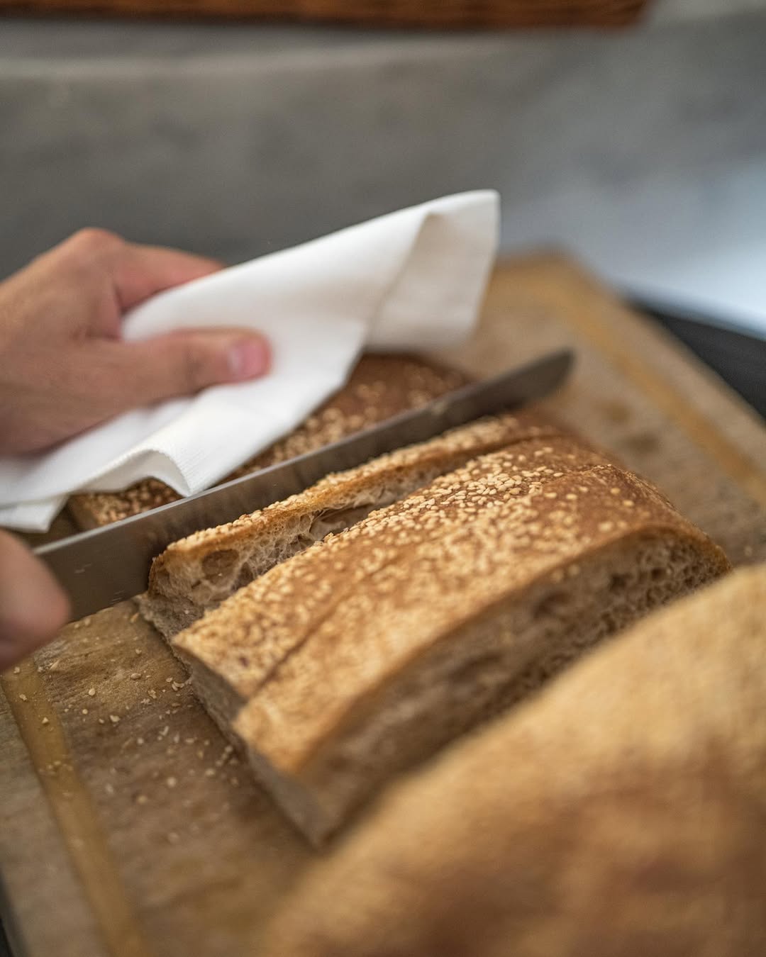 The restaurant makes its own bread. It is baked daily on site – without frozen semi-finished products. There are several types of bread on the menu: classic Greek, with olives, with spices. It is served immediately after baking, warm. This is the basic standard of the establishment, and part of the philosophy: if you can do better, you should do it.