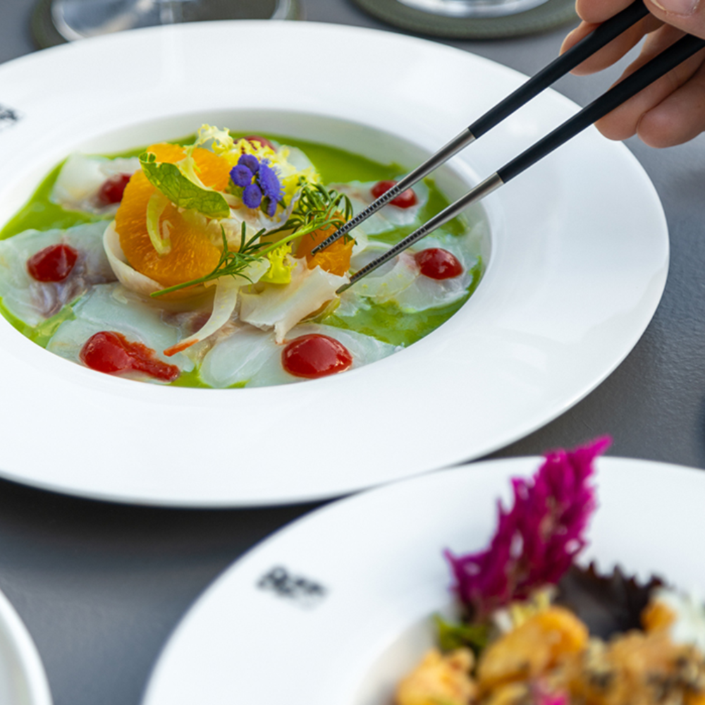 Platano – restaurant on the terrace overlooking the lake. The menu combines Mediterranean and Japanese cuisine with elements of international flavors.