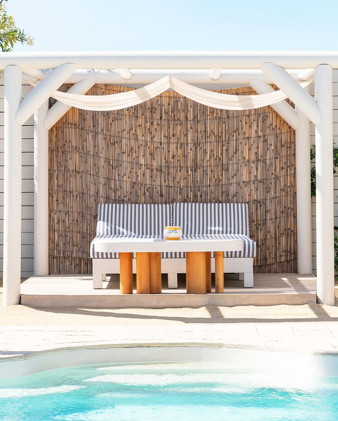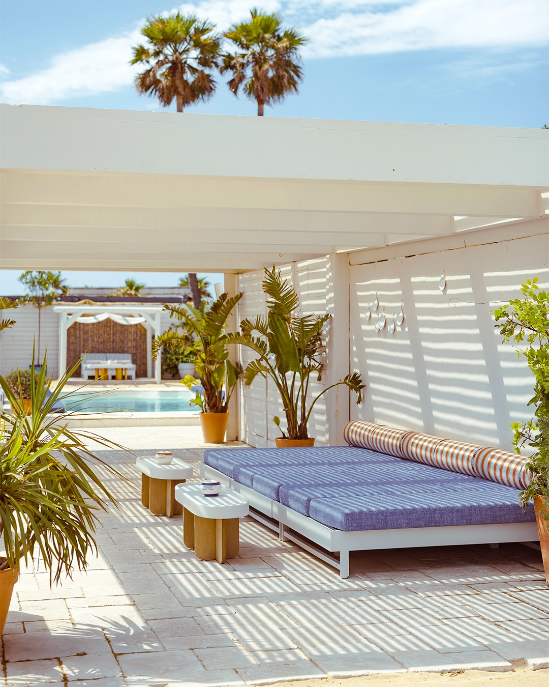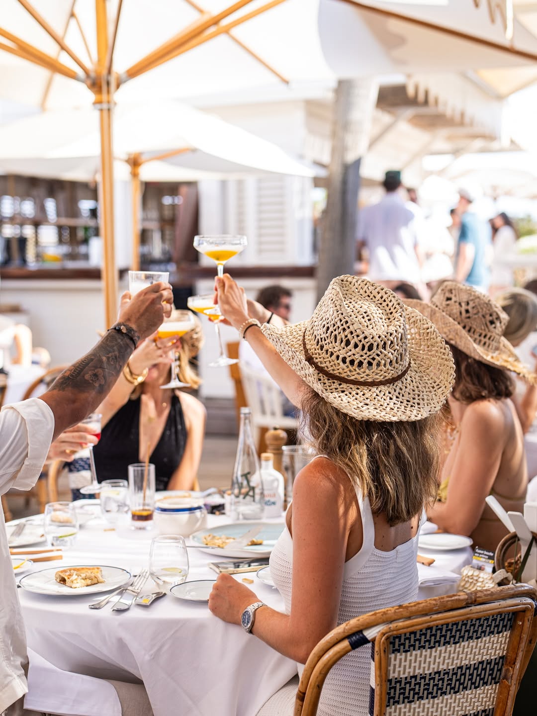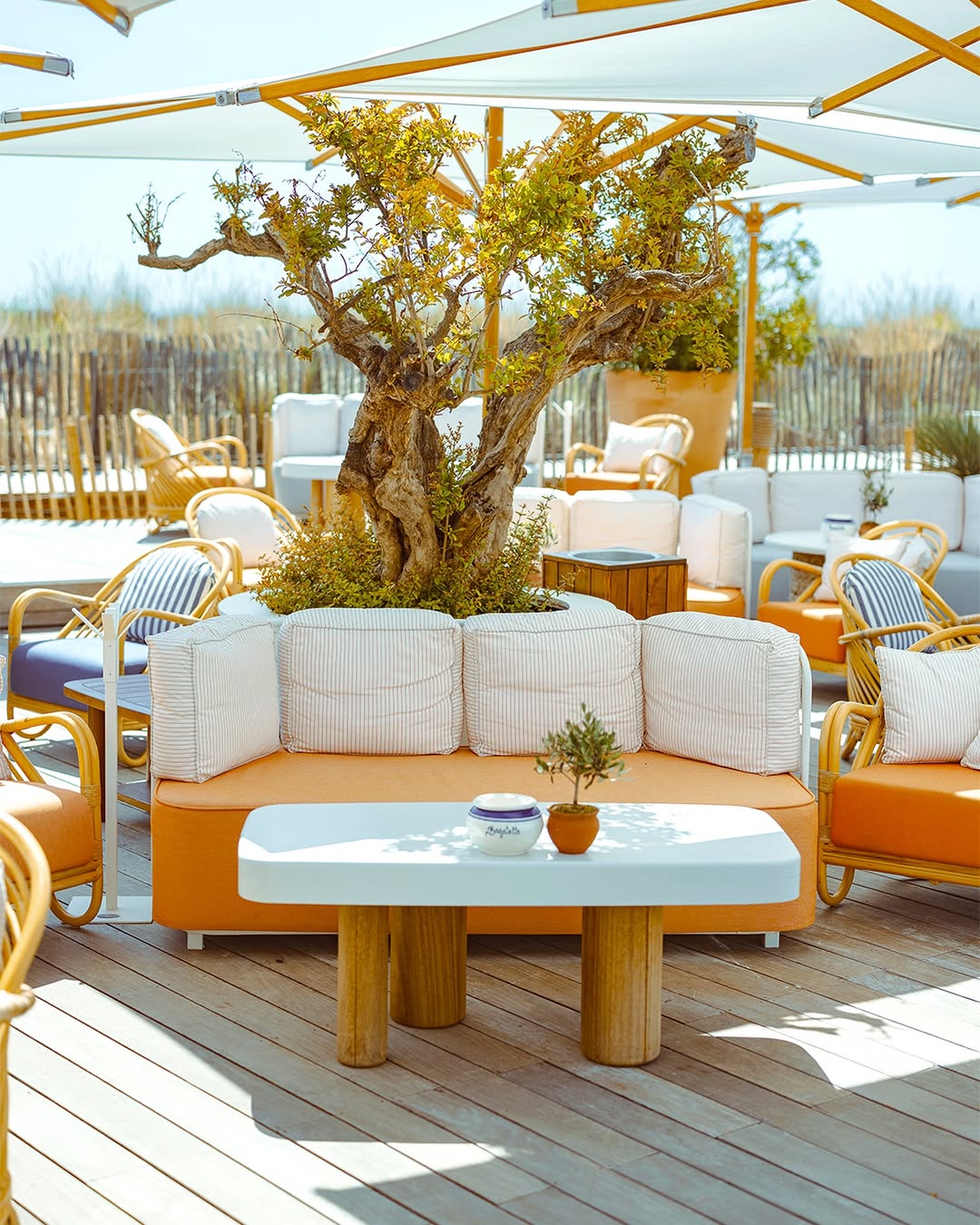 Днем тут панує розслаблена елегантність: тіні від гранатових дерев, білий пісок під ногами, усмішки офіціантів і перші келихи Provençal rosé.