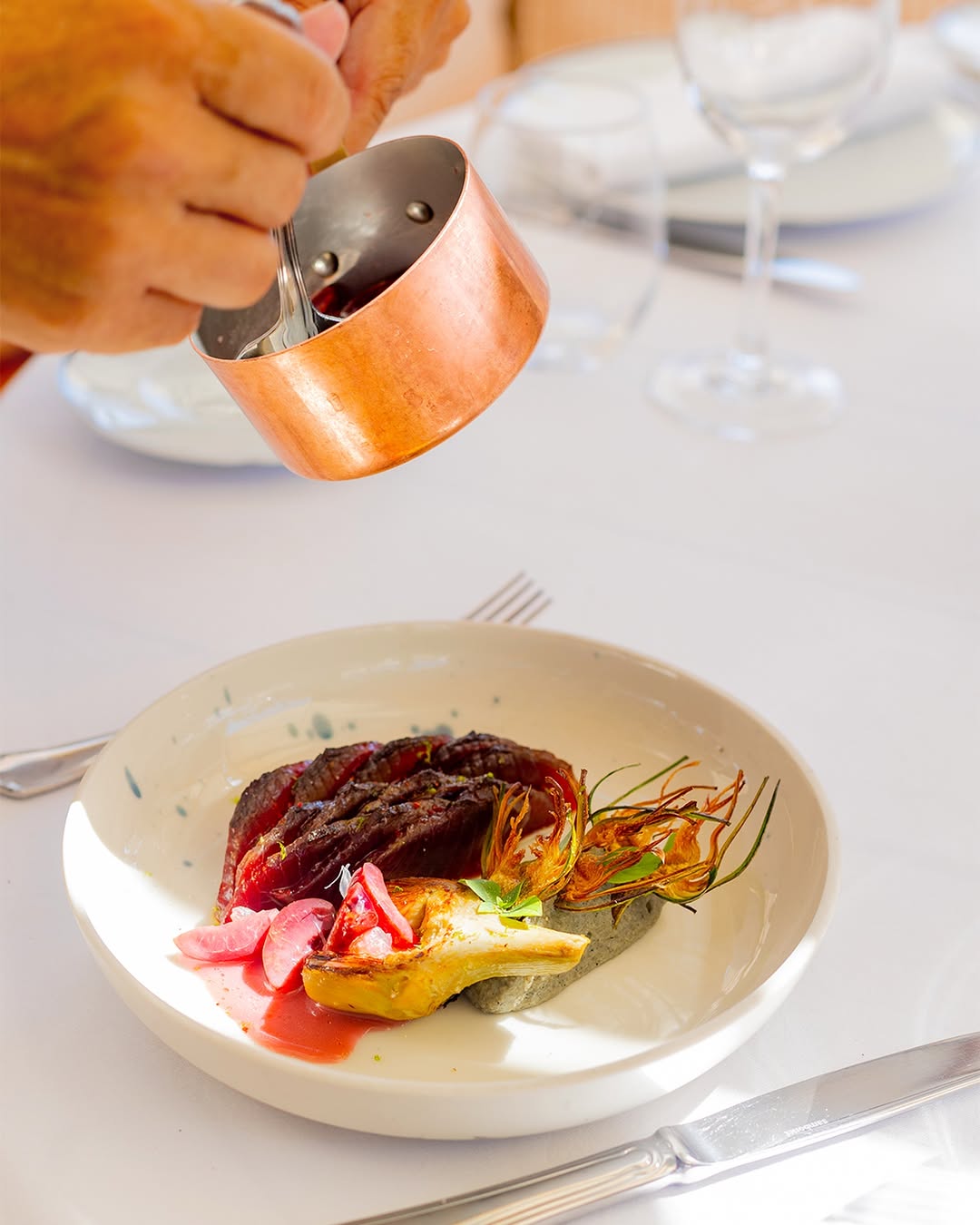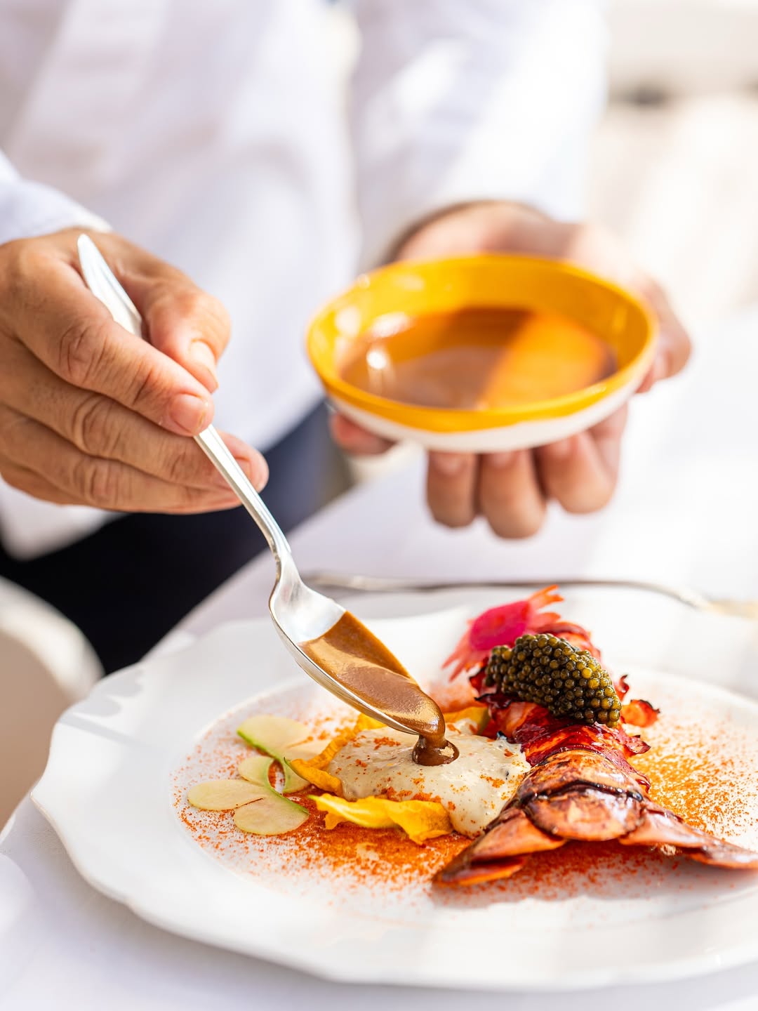 Пляшка шампанського стартує приблизно від €150 і може сягати кількох тисяч — залежно від формату та бренду. Винна карта зібрана навколо класики Провансу: легкі рожеві, свіжі білі та глибокі червоні.