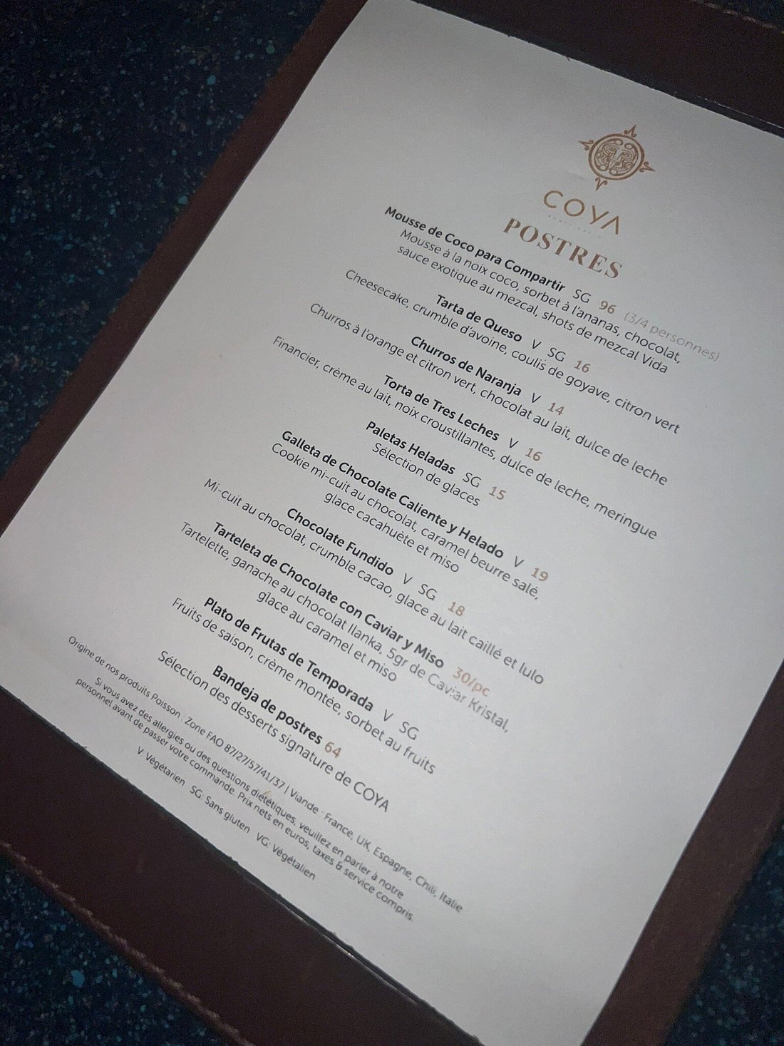 Меню COYA — це мікс культур, смаків і технік. Під керівництвом шеф-кухарки Вікторії Валленілла народжуються страви, в яких перуанська традиція живе у дуеті з японським мінімалізмом, китайською вогняністю та іспанською пристрастю.