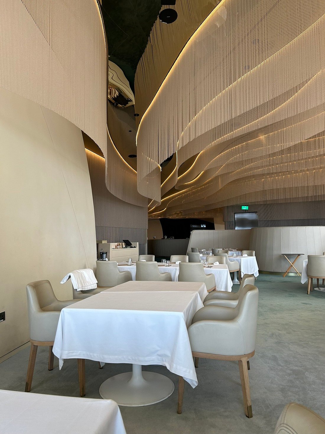 Понад чотири мільйони кришталевих намистин, що спадають зі стелі, створюють ефект занурення під воду, нагадуючи про традиційні рибальські сіті. Килими змінюють колір від пісочного до морської бірюзи, а меблі відтворюють форми дюн Кхор Аль-Адаїд.