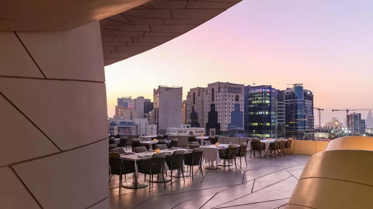 З тераси ресторану відкривається захоплюючий вид на затоку Дохи, набережну Корніш та архітектурні шедеври, такі як стадіон 974.
