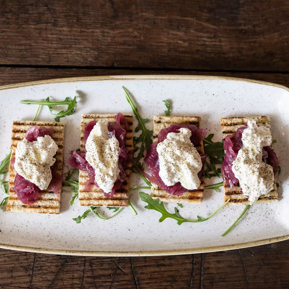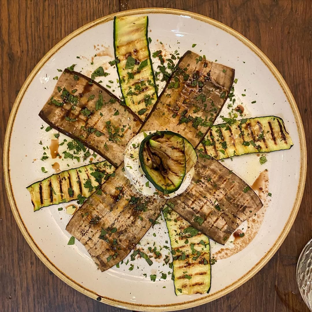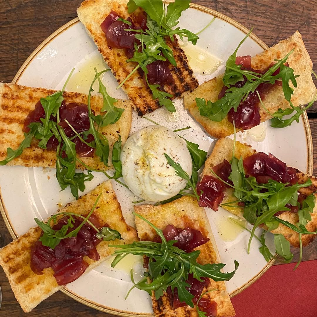 класична буррата з грінками, карамелізованою цибулею та руколою (Burrata con cipolla caramellata e rucola) – 25$Grigliata di Verdure — грильовані овочі (баклажани, цукіні, перець), заправлені оливковою олією та бальзамічним соусом.Crostini con cipolla caramellata e stracciatella — грінки з карамелізованою червоною цибулею, кремовою страчателлою та руколою – 18$Tagliatelle alla Bolognese — домашня паста з соусом болоньєзе та свіжотертим пармезаном – 32$Focaccia della casa — домашня фокача з оливковою олією, сіллю та травами (іноді подають із прошуто або страчателлою) – 13$