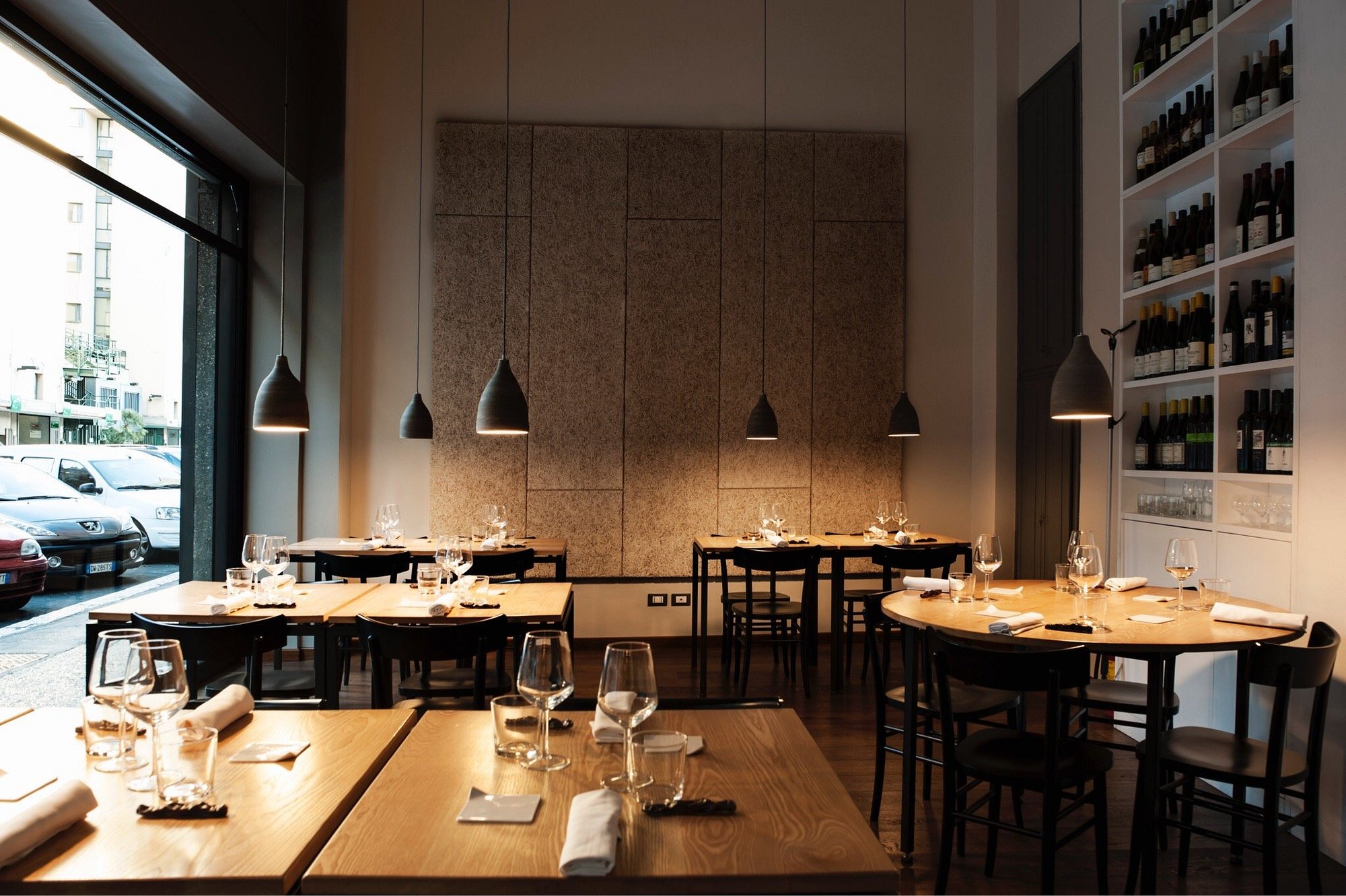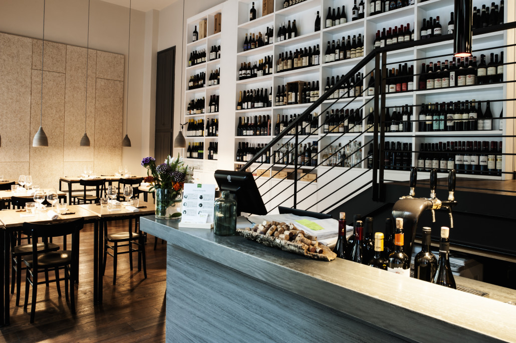 Інтер’єр ресторану — це поєднання мінімалізму та тепла. Двоповерховий простір з вбудованими винними полицями створює атмосферу сучасної бібліотеки, де кожна деталь продумана до дрібниць. Це ідеальне місце для романтичної вечері або особливого святкування.