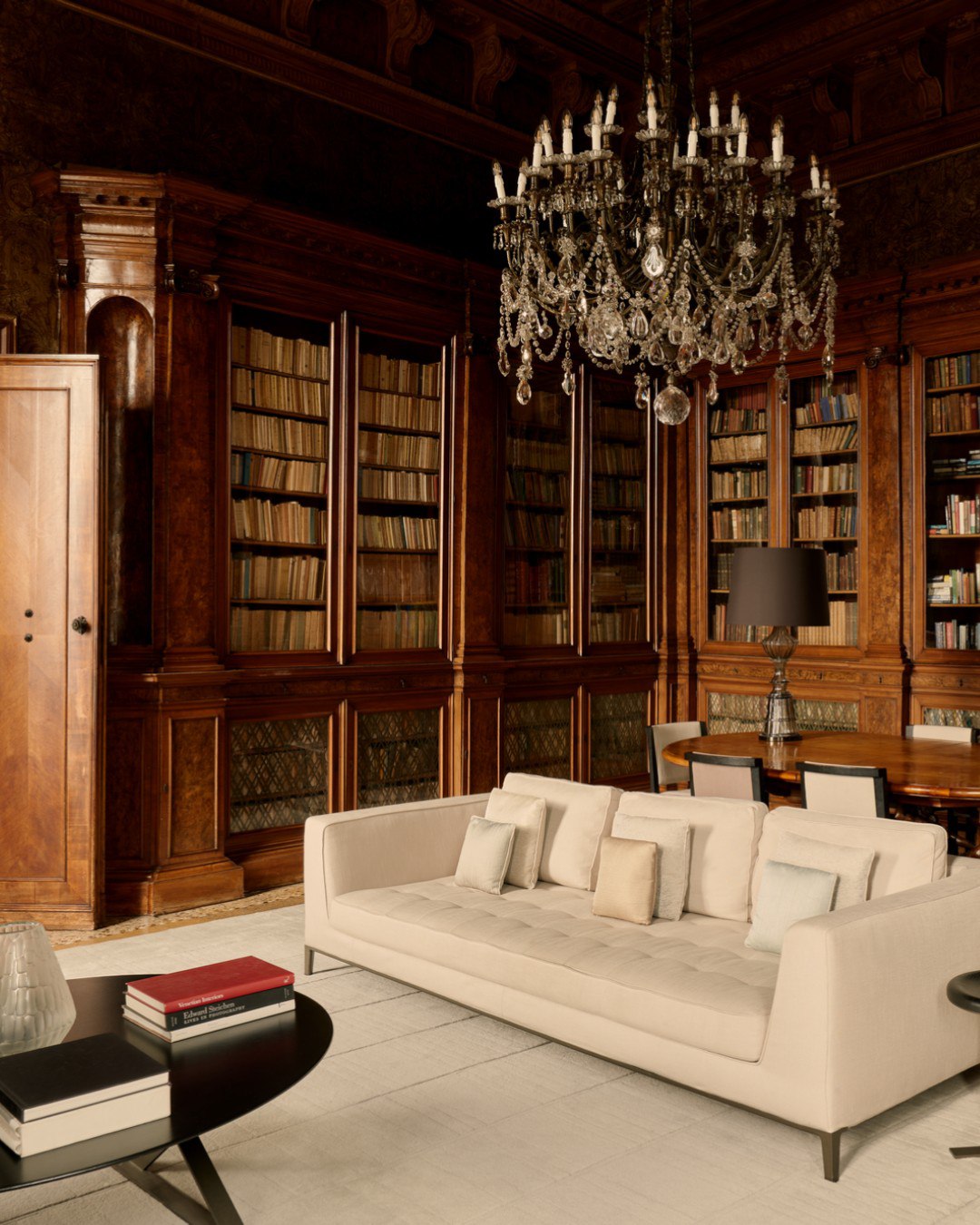 Aman Venice має власну бібліотеку, яка є ідеальним місцем для відпочинку та натхнення. Ця інтимна кімната, розрахована на 8 осіб, оформлена шкіряними стінами та позолоченими деталями, що створює атмосферу спокою та елегантності. Бібліотека містить колекцію старовинних книг, що належали родині Аррівабене, а також сучасні видання.