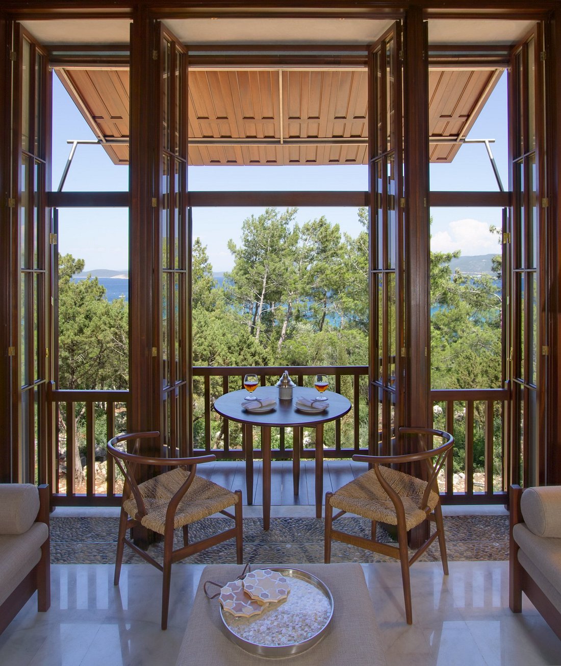 Інтер’єр стриманий і текстурний: натуральне дерево, турецька плитка ручної роботи, антикварні килими. Простір створений так, щоби не відволікати, а заспокоювати. Вікна виходять у соснові ліси, а вночі чути тільки цикад і вітер.
