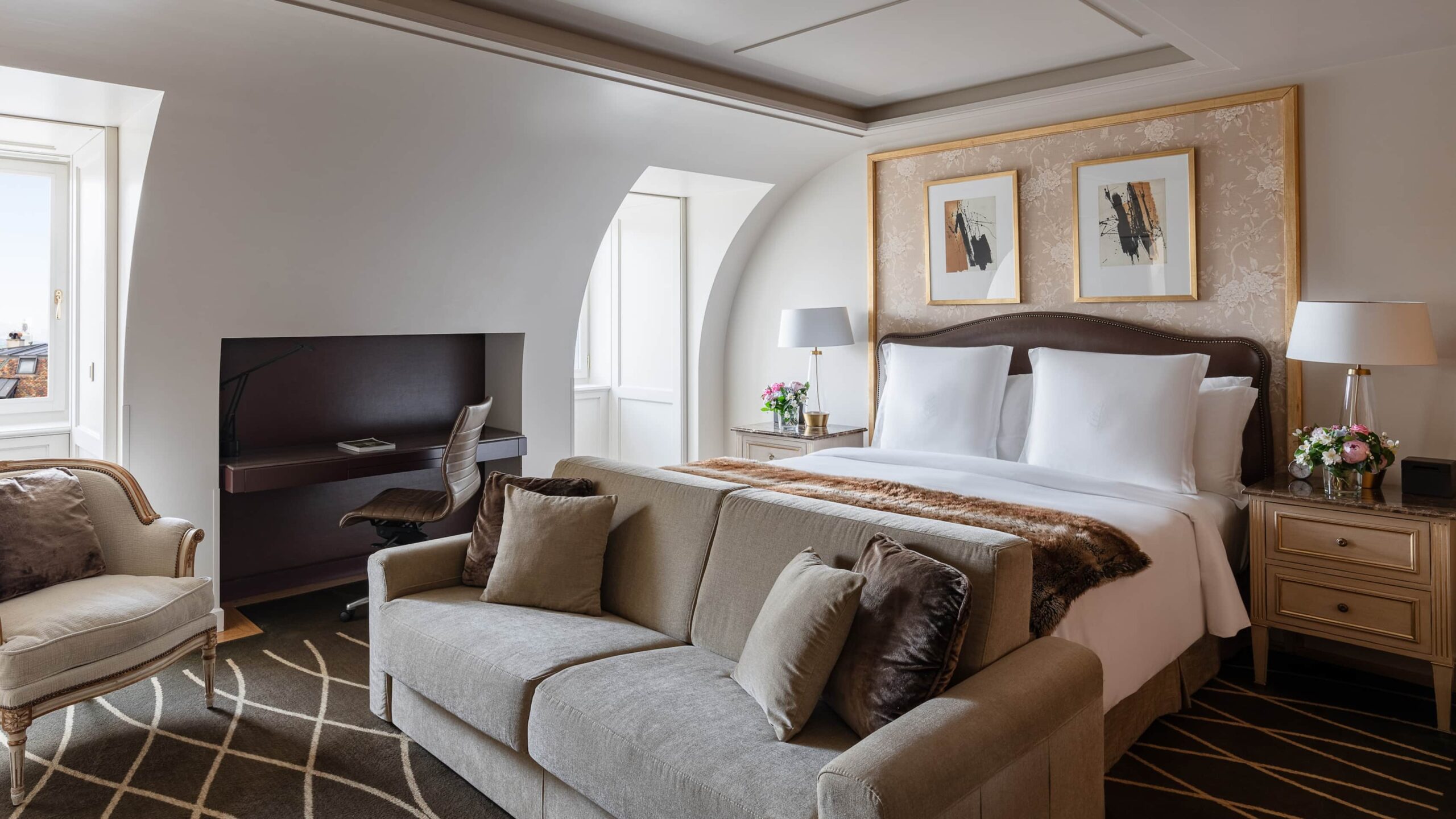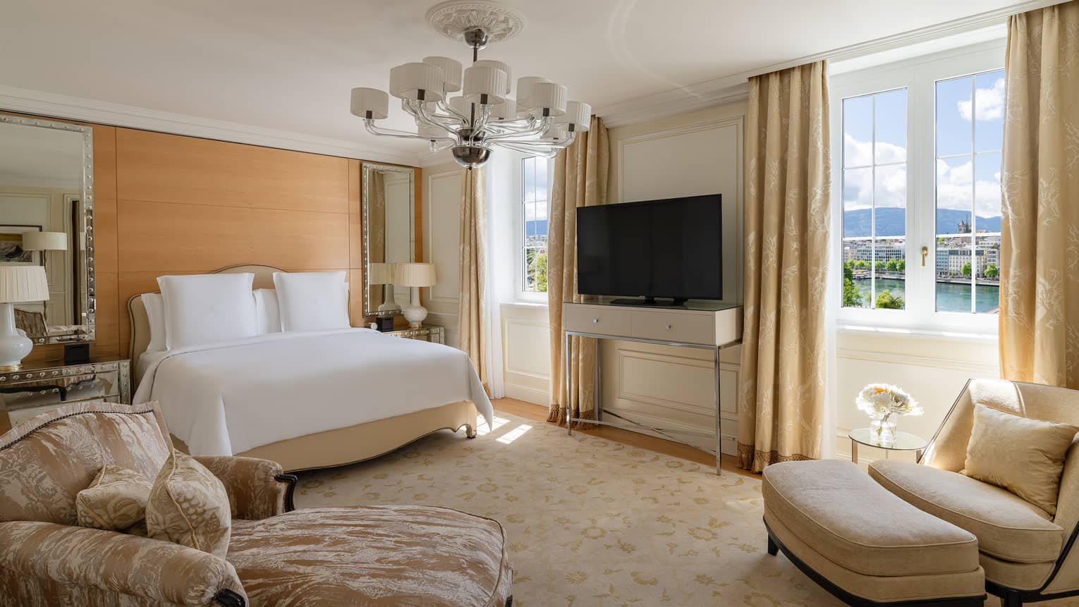 Four Seasons Geneva пропонує одну з найширших лінійок категорій номерів у місті: від стандартних кімнат до королівських апартаментів із видом на Альпи та Леман.