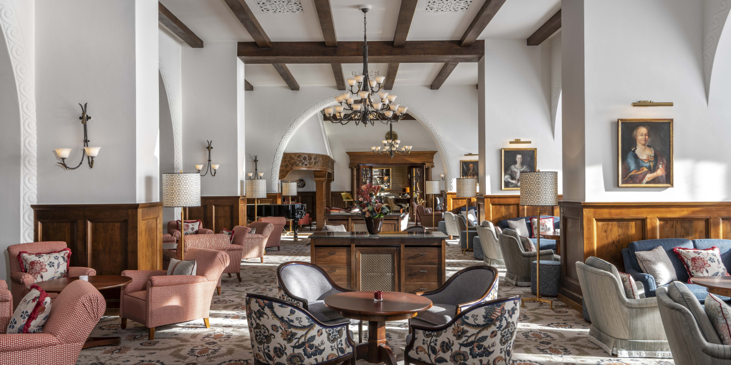 Інтер’єр поєднує класику стилю Belle Époque з сучасним комфортом: багато дерева, тепле освітлення, панорамні вікна, високоякісні матеріали.