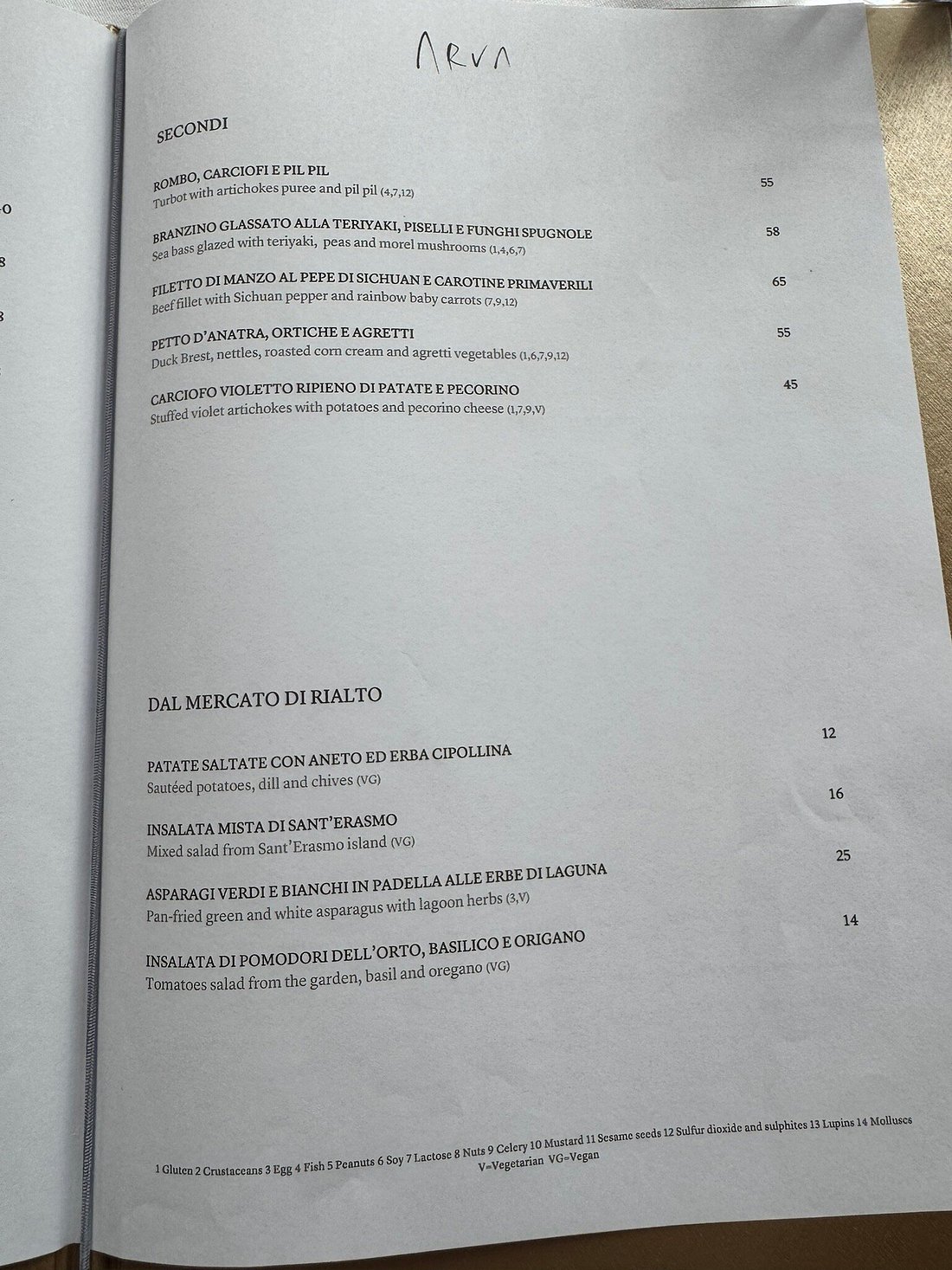 Название Arva происходит от латыни и означает “обрабатываемая земля”. Здесь главная роль принадлежит качественным продуктам: морепродукты поступают из лагуны, овощи и зелень – с фермерских рынков Rialto, оливковое масло и паста – от небольших итальянских производителей. Кухня ресторана не про эффектность, а про чистоту вкуса и баланс.