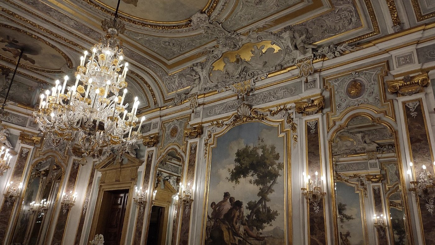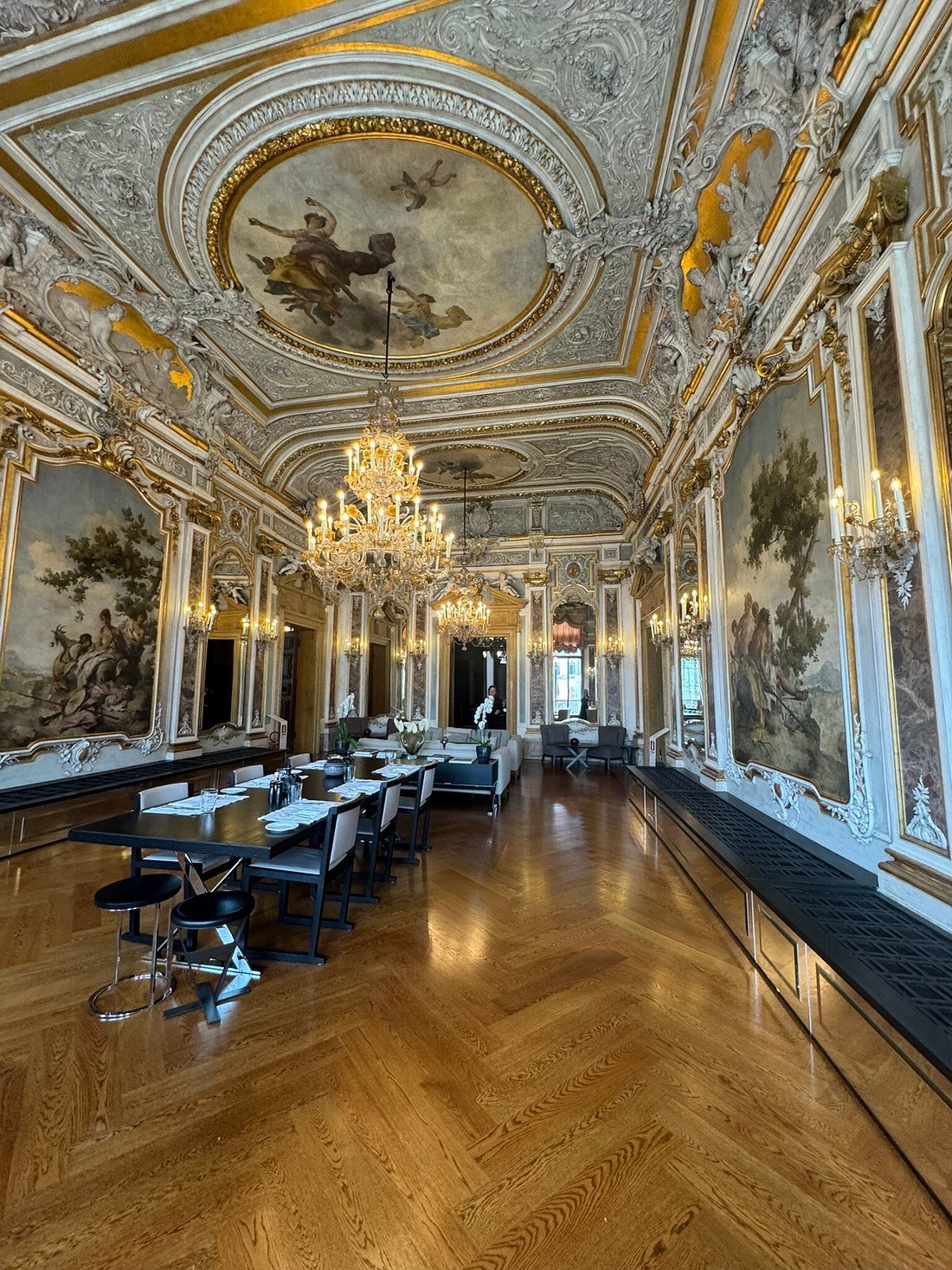 Залы Palazzo Papadopoli украшены фресками и антикварной мебелью, создающей ощущение аристократического вечера.