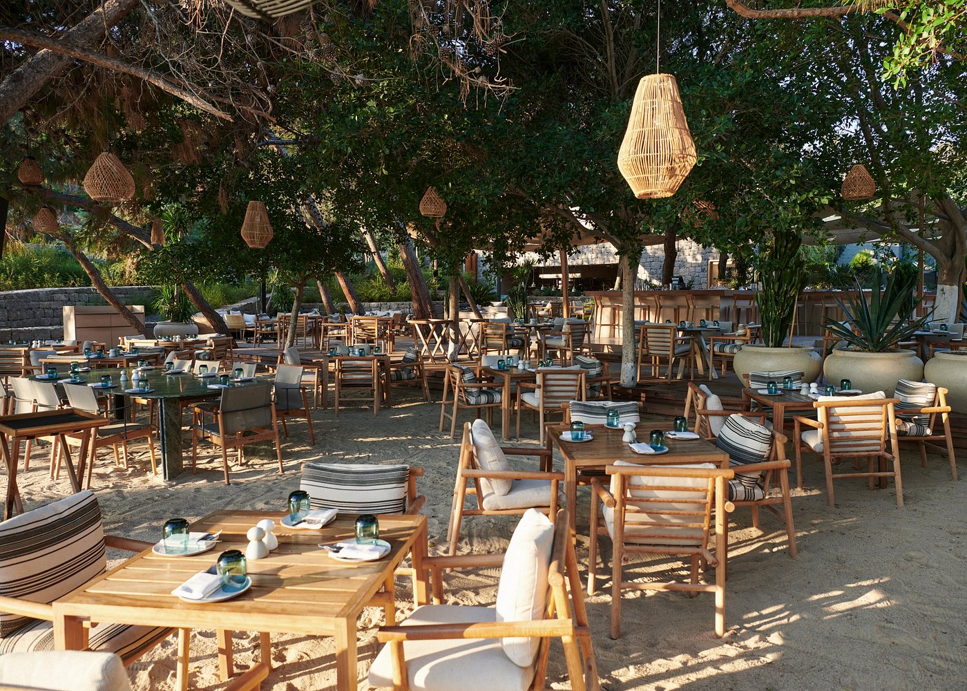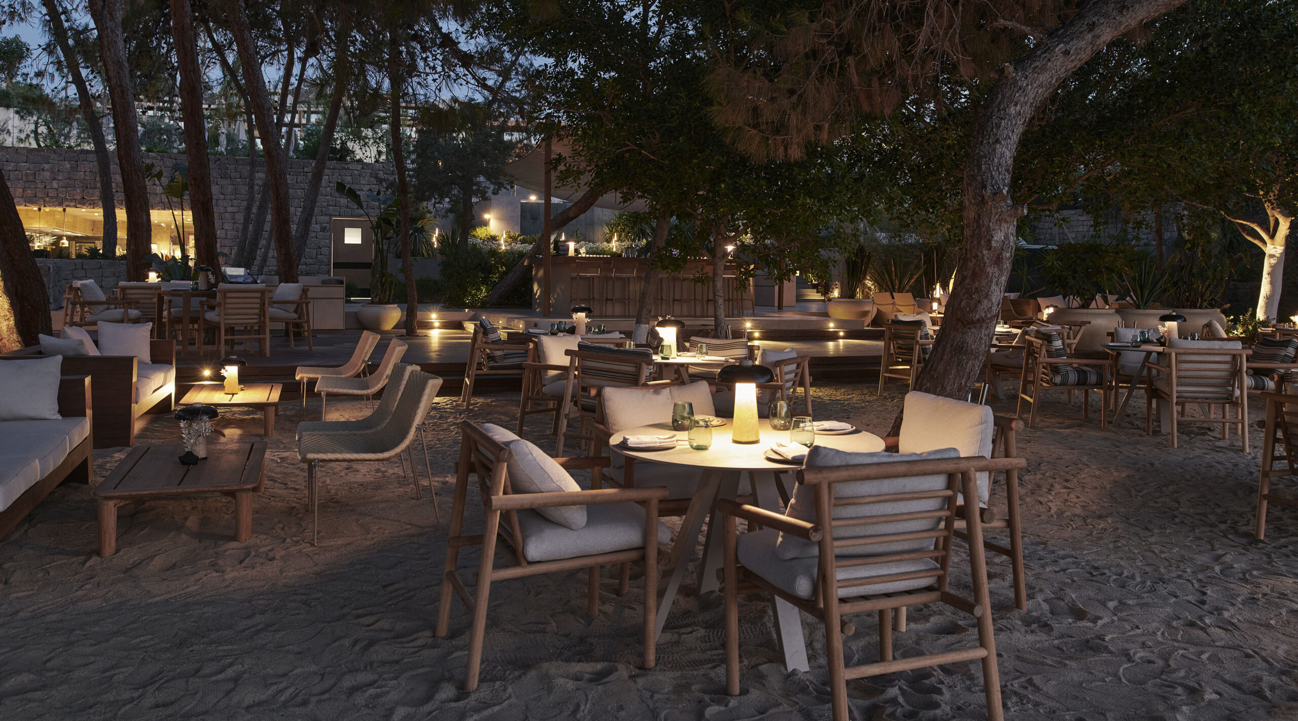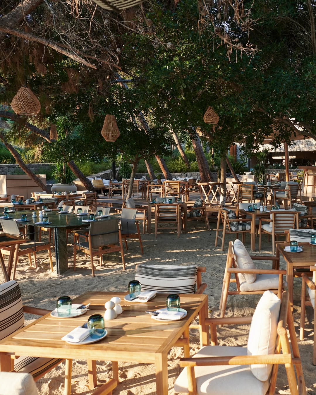 Весь курорт буквально встроен в сосновый лес и скалы Эгейского побережья, а сам ресторан расположился на открытой террасе с видом на море.