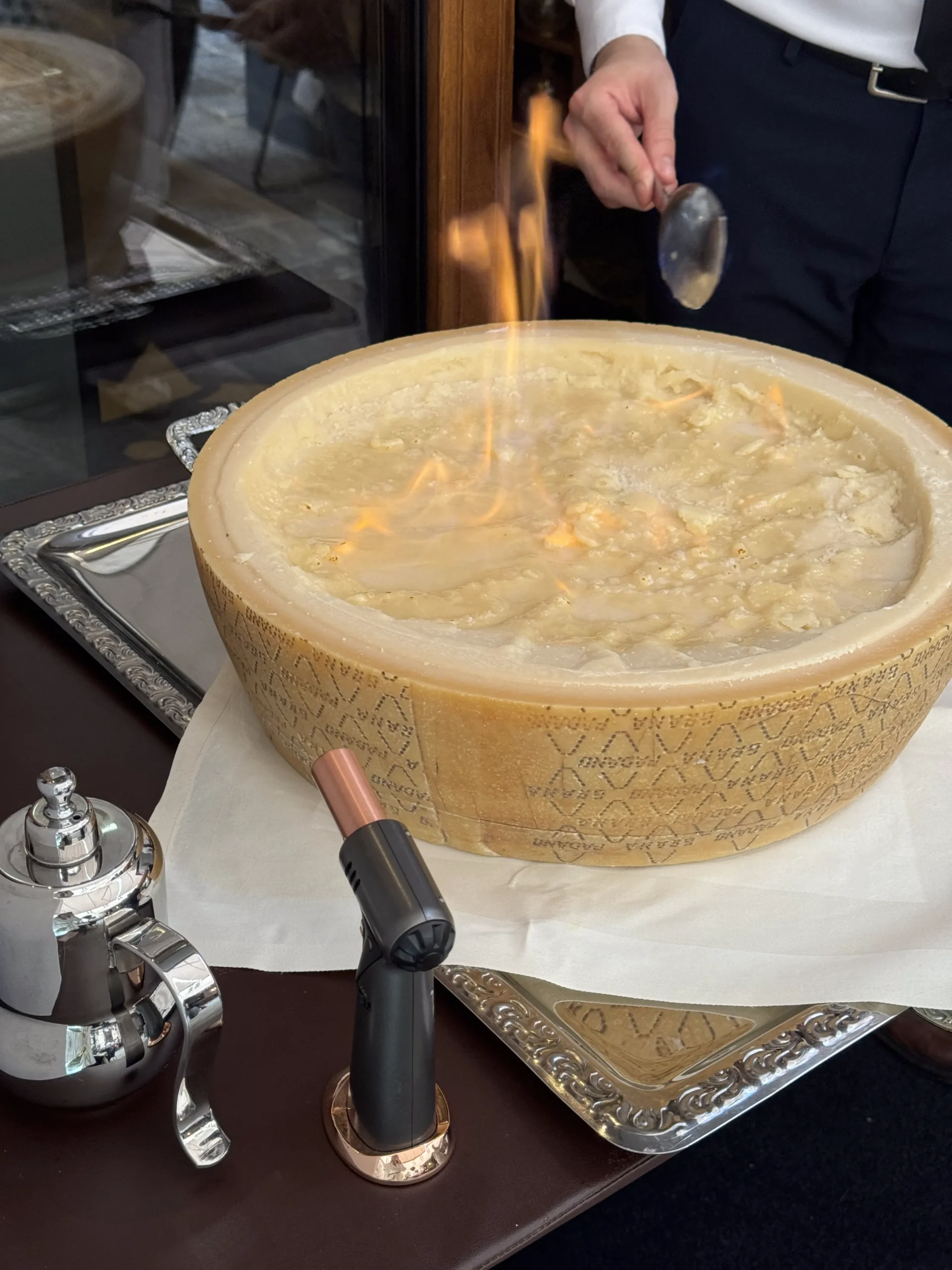Первым делом к столу приносят большое сырное колесо. Его специально подогревают, чтобы сыр внутри стал мягким и тягучим, готовым к смешиванию с ризотто или пастой.