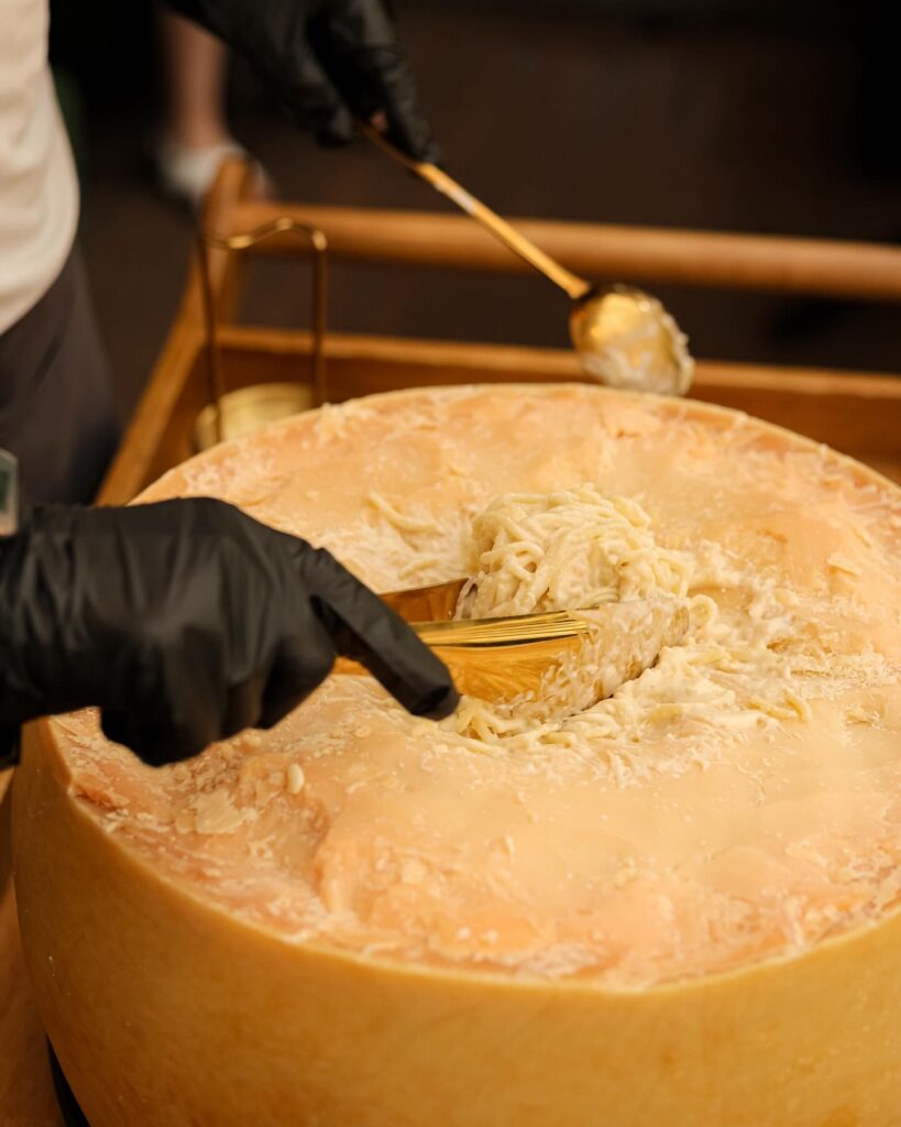 Следующим шагом прямо перед гостем в середину колеса кладут горячий ризотто или пасту. Благодаря теплу, сыр начинает растворяться еще больше, создавая нежную текстуру.