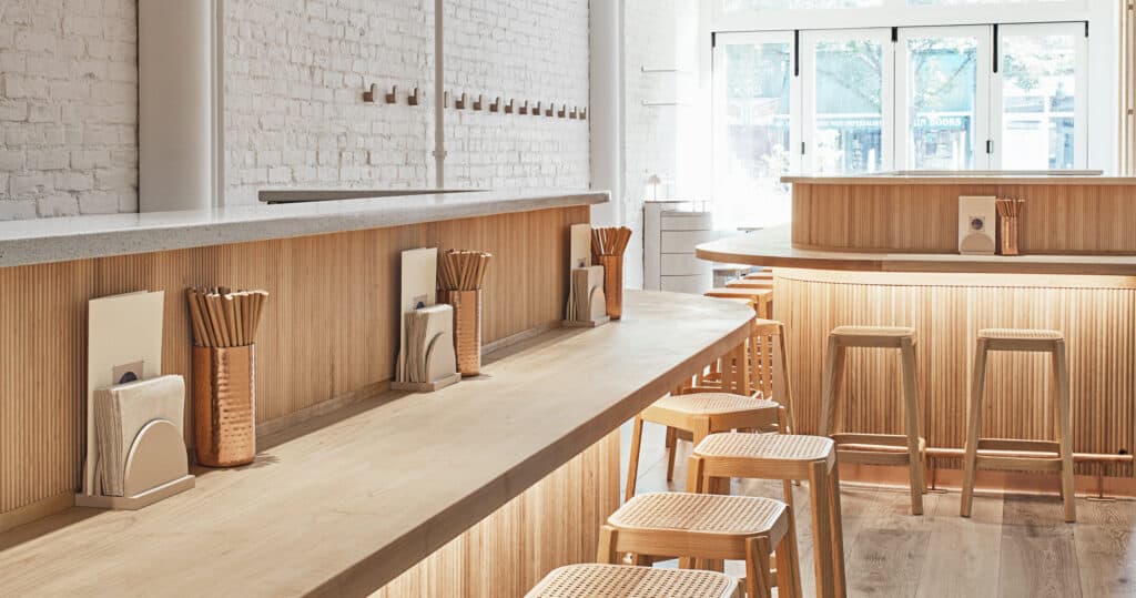Интерьер Nami Nori отражает концепцию минимализма и элегантности, характерную для японской эстетики. Пространство украшено светлыми цветами с использованием природных материалов, таких как дерево и камень, что создает уютнуюу та спокійну атмосферу — справжній оазис серед енергійних вулиць Вест-Віллідж.